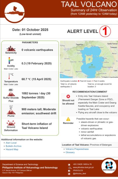 PHIVOLCS reiterated its warning against entry into Taal Volcano Island—classified as a Permanent Danger Zone (PDZ)—especially around the Main Crater and Daang Kastila fissures, as well as the use of the lake for boating or aircraft flights near the volcano.
